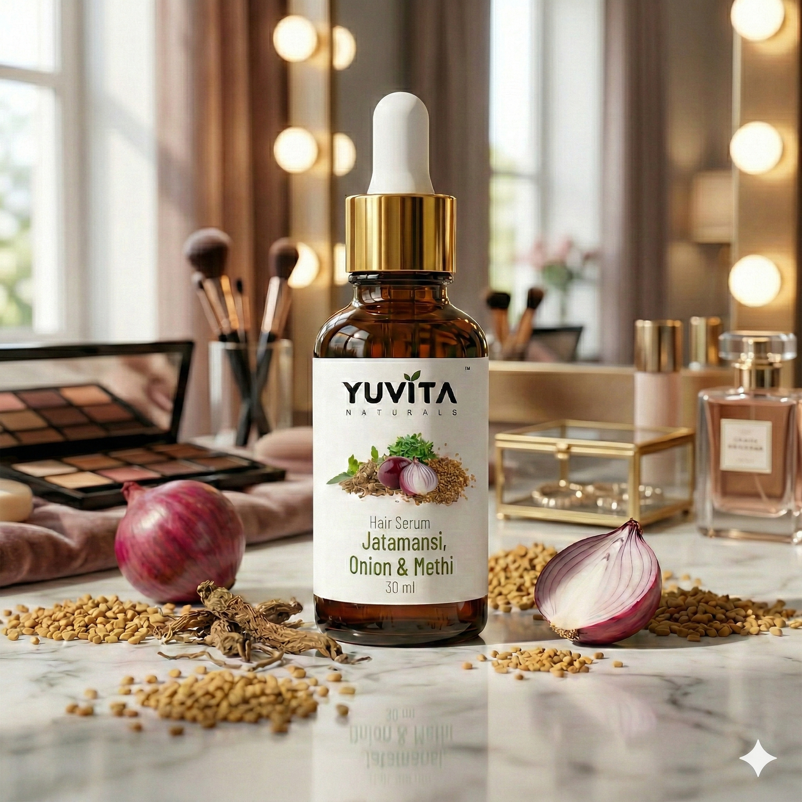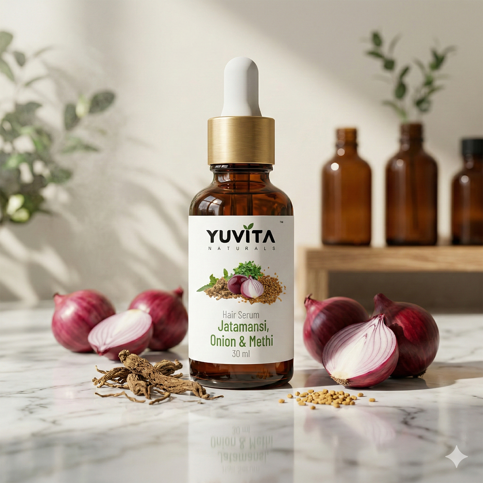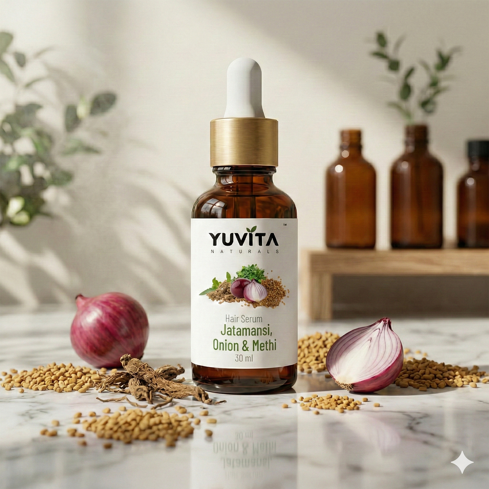 Immerse your hair in the refined elegance of botanical care with this luxurious Hair Vitality Serum, enriched with Jatamansi, Onion, and Methi. Thoughtfully crafted to nourish the scalp and strengthen each strand, this serum enhances natural shine while restoring softness and resilience. With every application, it transforms your daily routine into a calming ritual of sophistication, where ancient botanical wisdom meets modern refinement for visibly healthier, radiant hair.